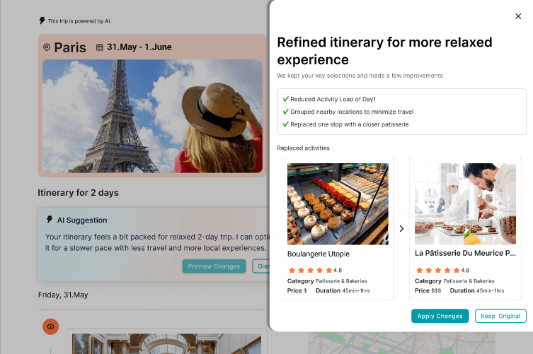 To help users optimize their itinerary without losing control, I added an inline AI suggestion feature.
